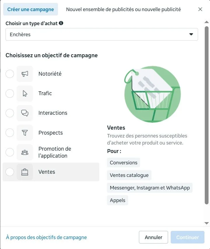 Contrairement au “boost de publications”, il vous donne le contrôle total : choix de l’objectif (ex. générer des ventes), ciblage précis, suivi des résultats…
